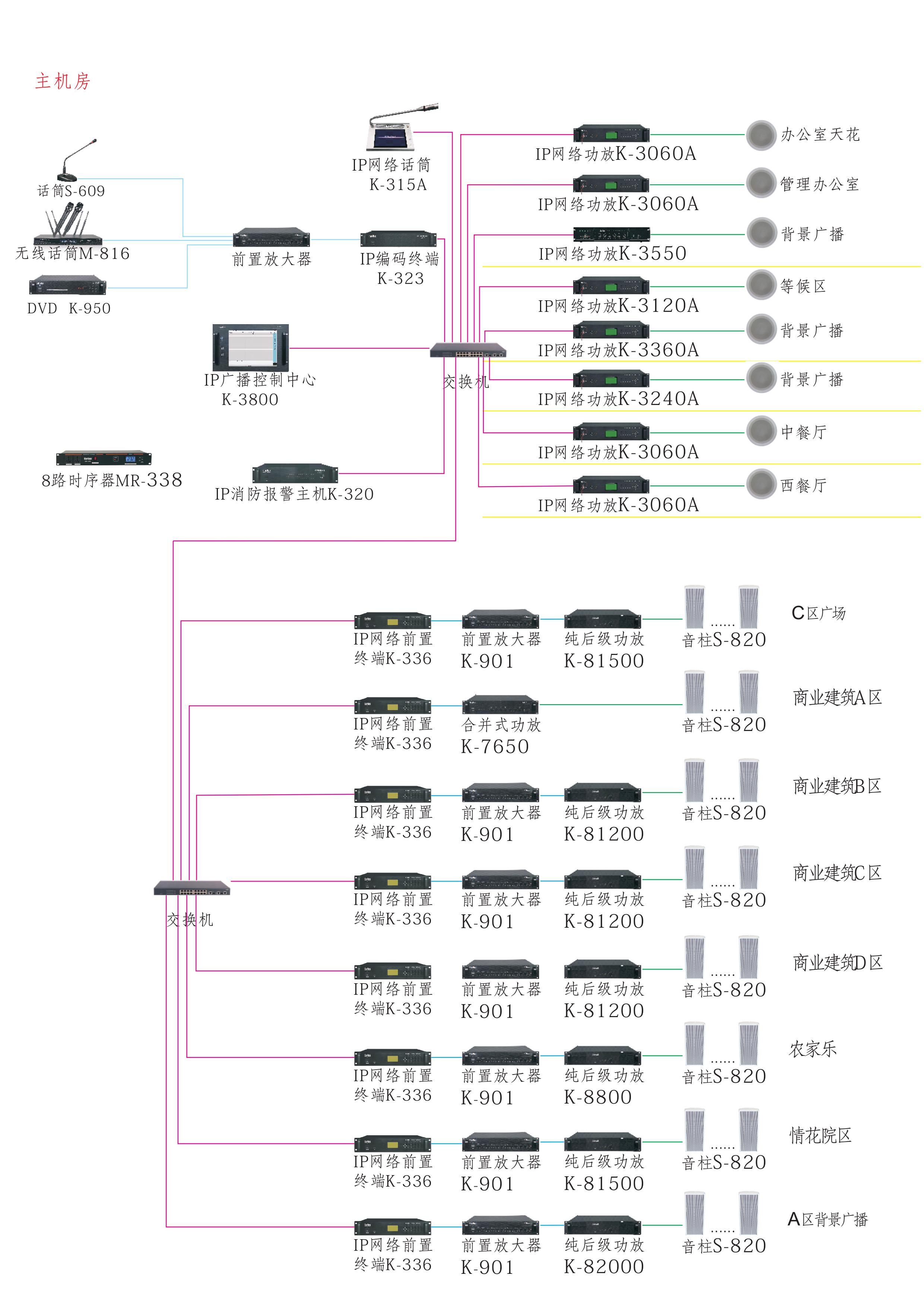 各樓層選用性價比高的8分區IP網絡音頻輸出單元,單臺終端和功放可以管理8個樓層音頻信號,同時可選用6備1的主備切換器。