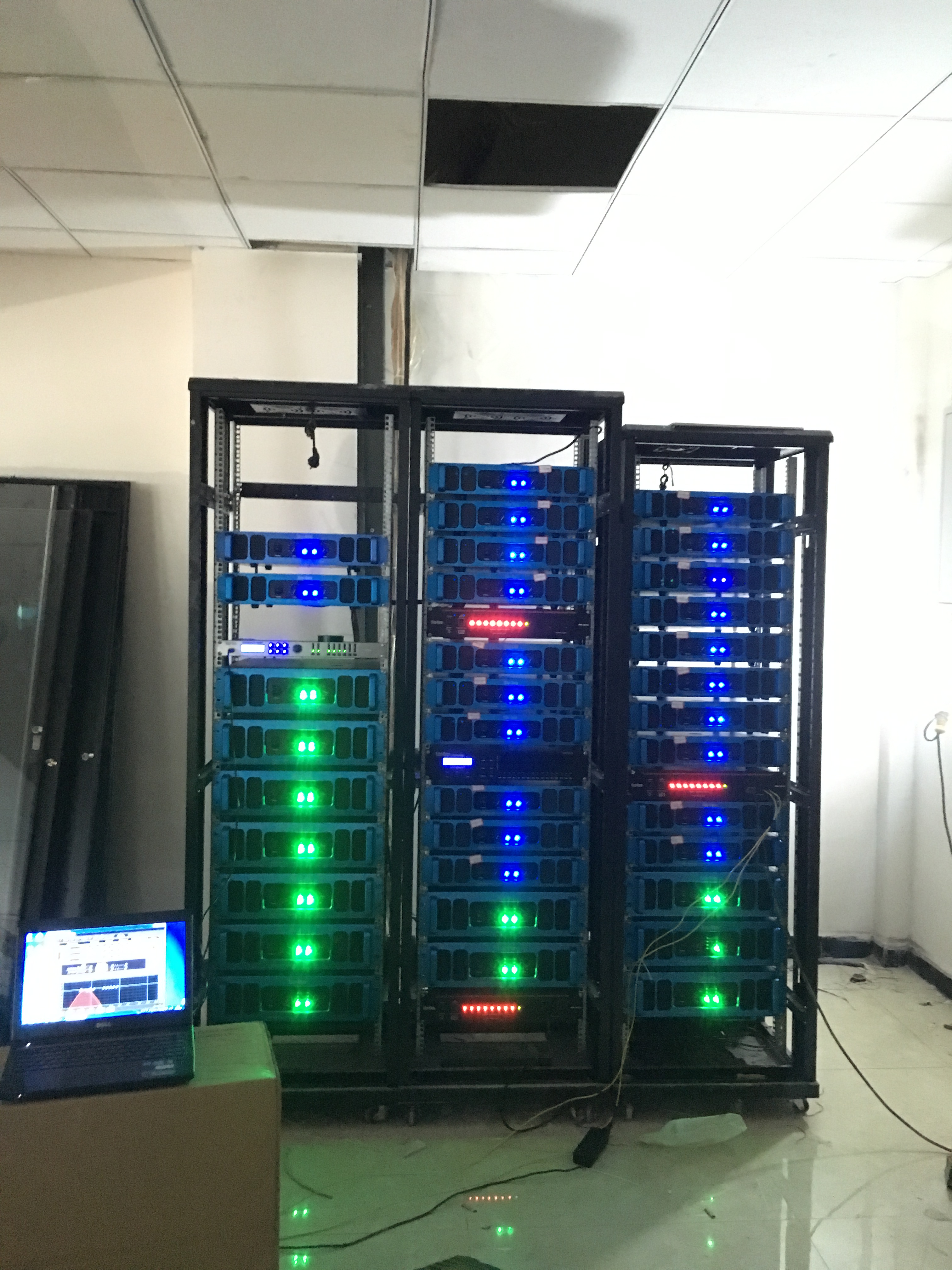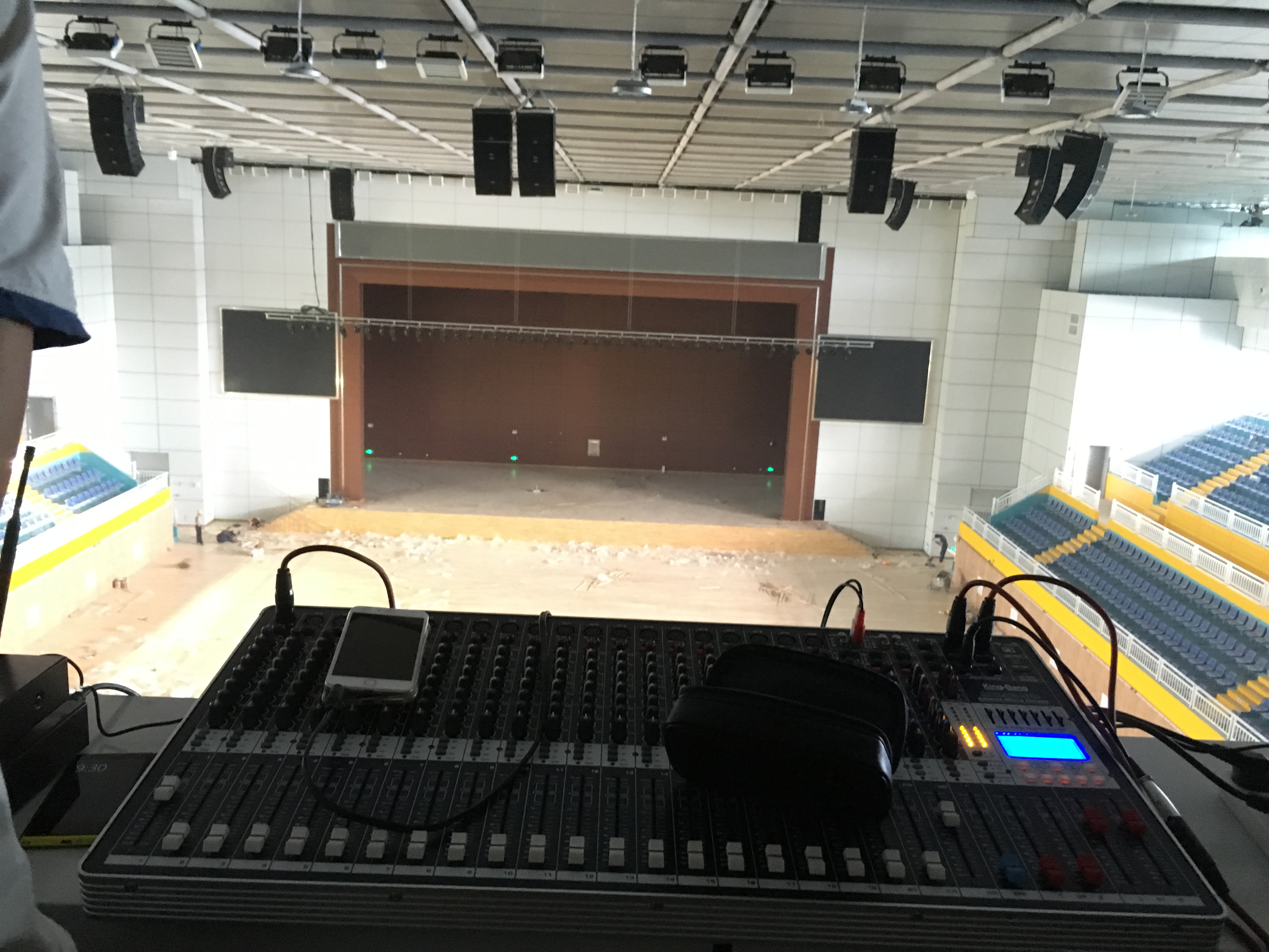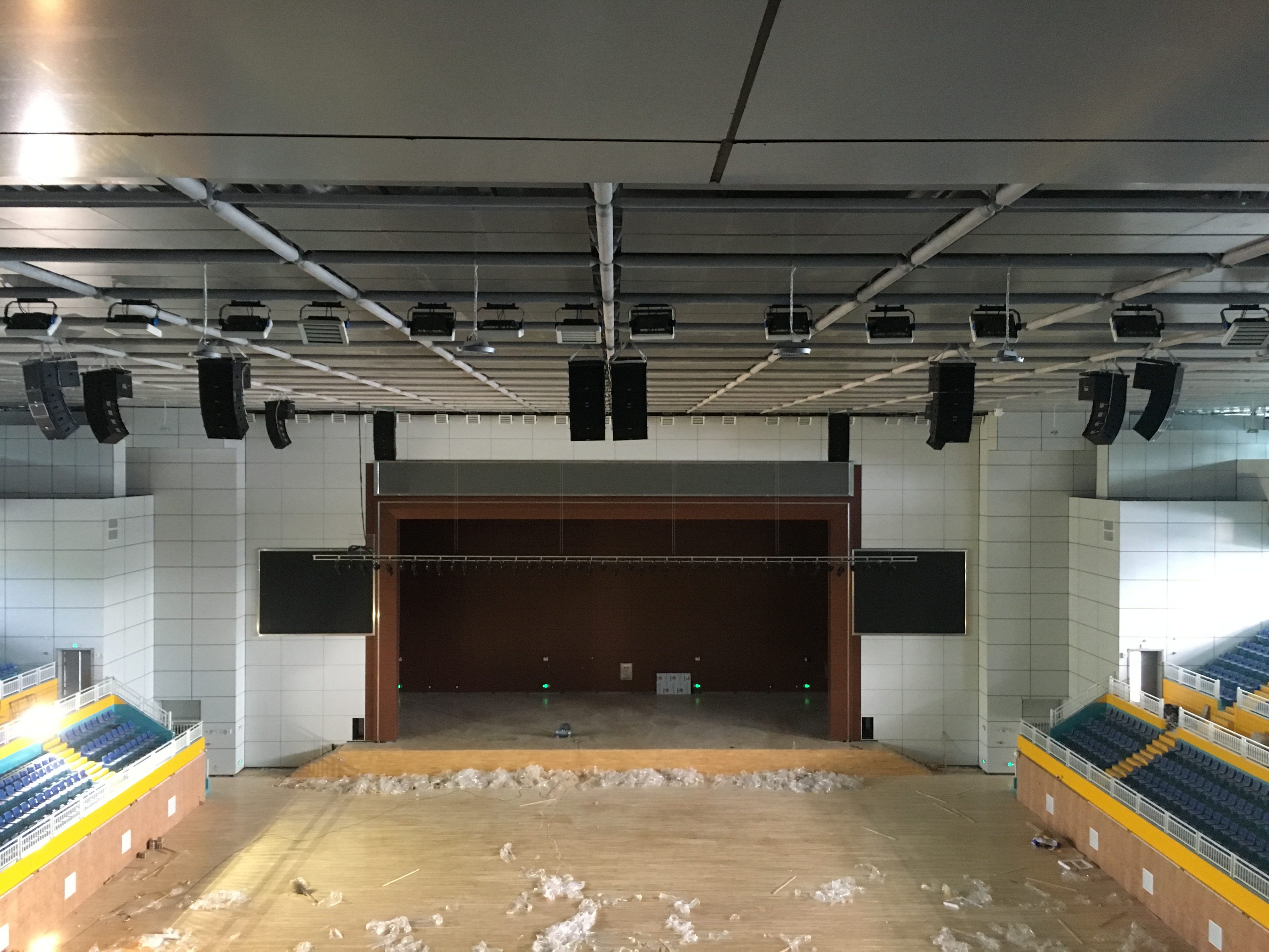 在體育館的左右兩側(cè)分別裝了2只KS-218雙18寸線性陣列-低音炮,16只KS-208雙8寸線性陣列-全頻,10只KS-118線性陣列-低音炮做為主擴(kuò)系統(tǒng)。