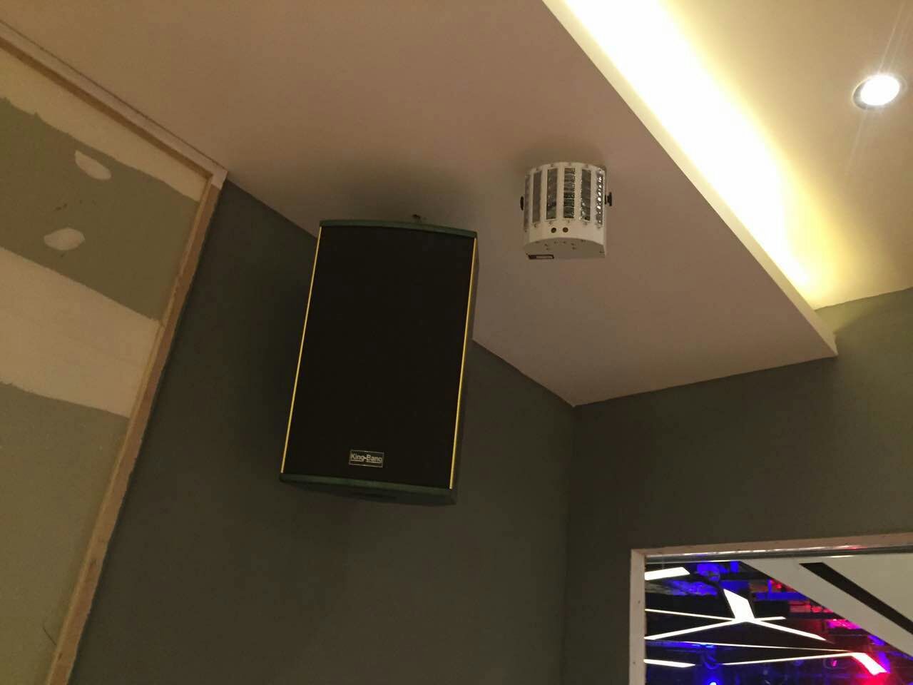 整個系統包括KT-10的兩分頻單10"卡包箱以及S-166的優質的天花喇叭,所有音箱由兩臺K-7500合并式功放500W,DSP-100的專業數碼HI房卡拉OK前級。整個系統主要用于背景音樂的播放。