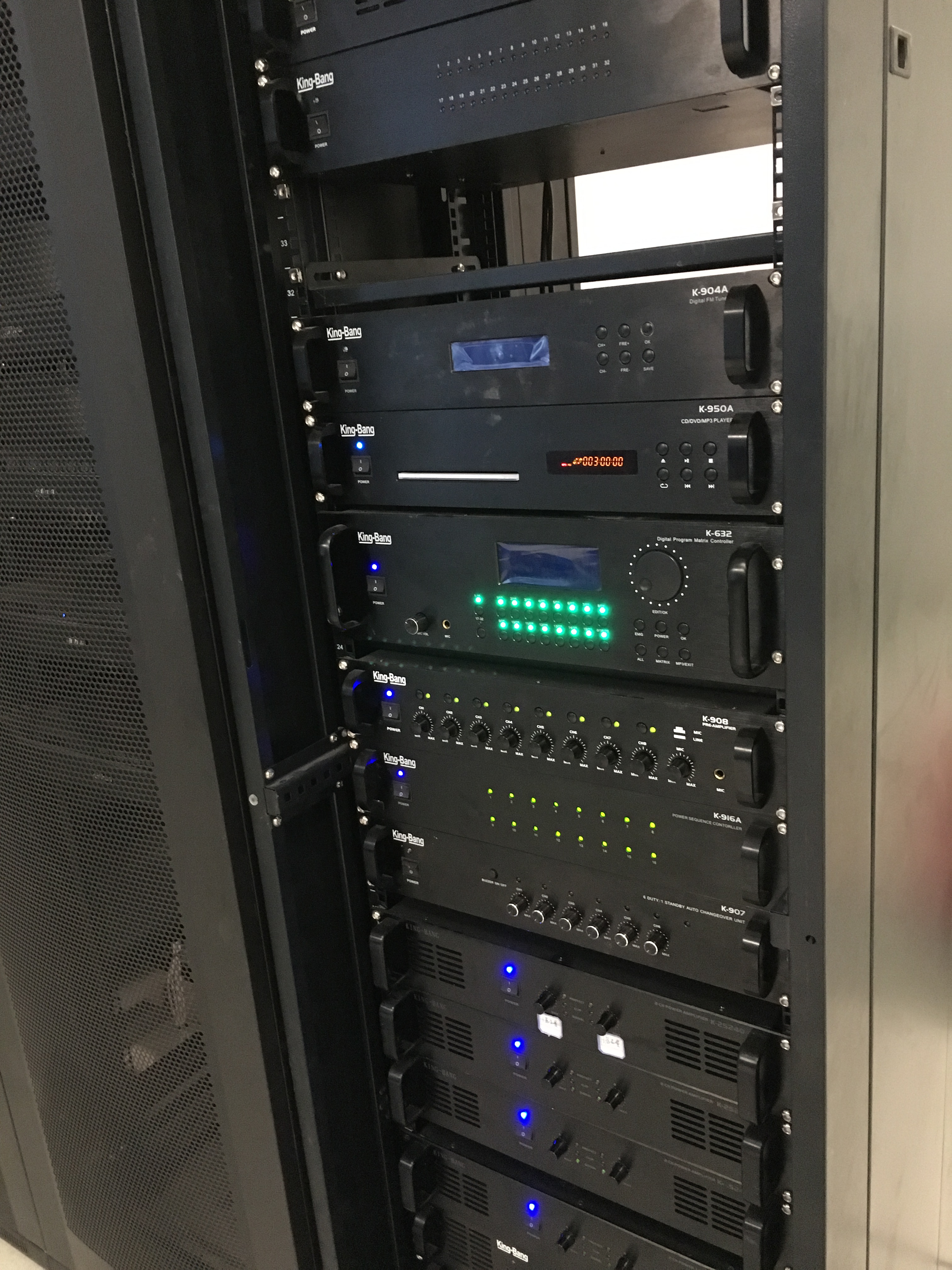 該項目共配置了1套智能廣播系統,由控制中心同時控制博物館所有區域的背景音樂、定時打鈴、尋呼廣播等功能。京邦電子(KING-BANG)廣播系統是集播放、智能定時控制、遠程尋呼、智能消防聯動等功能于一身的公共廣播系統。